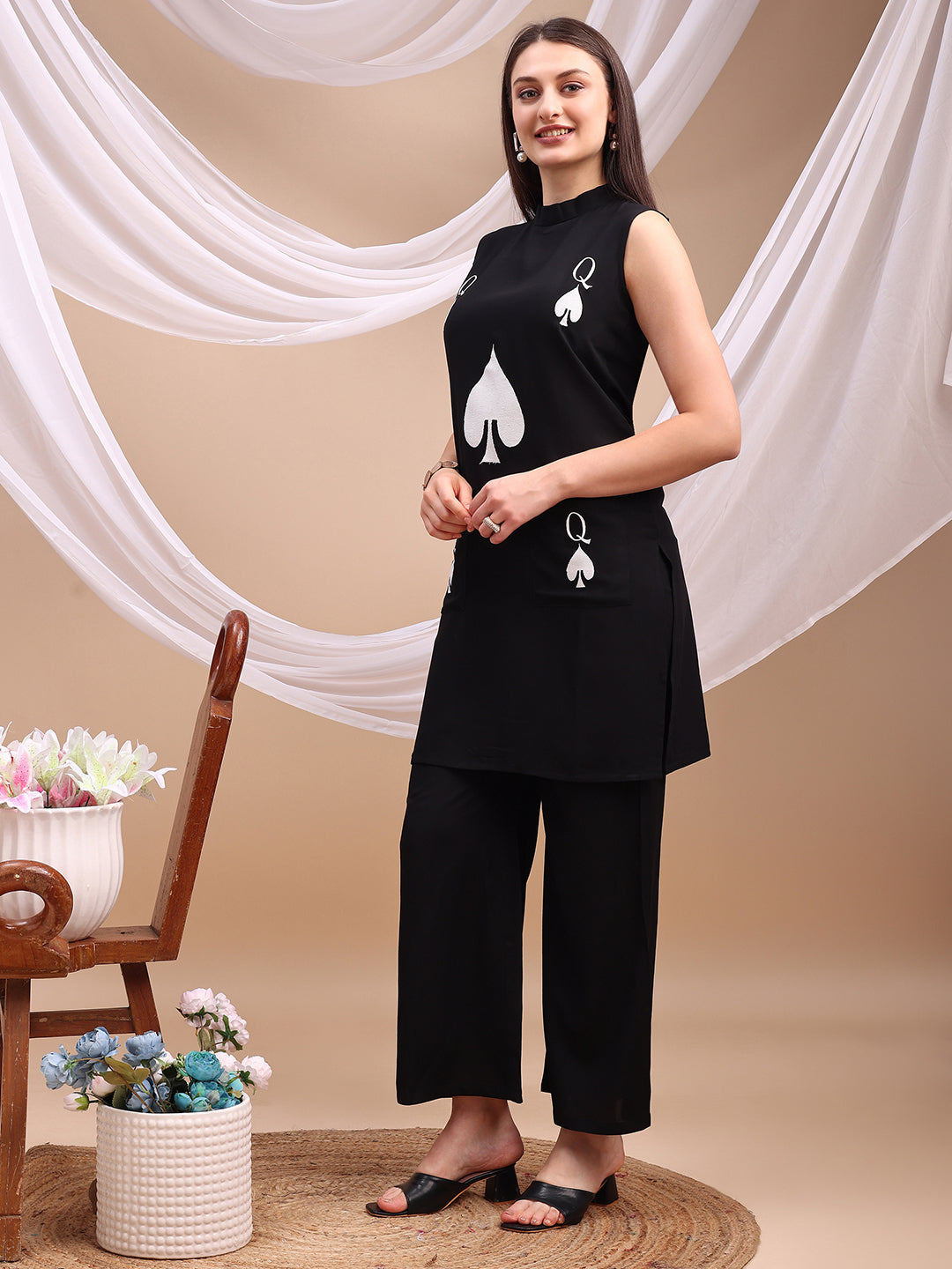 Black Queen of Hearts Embroidered kurta with Pockets Co-ords Set