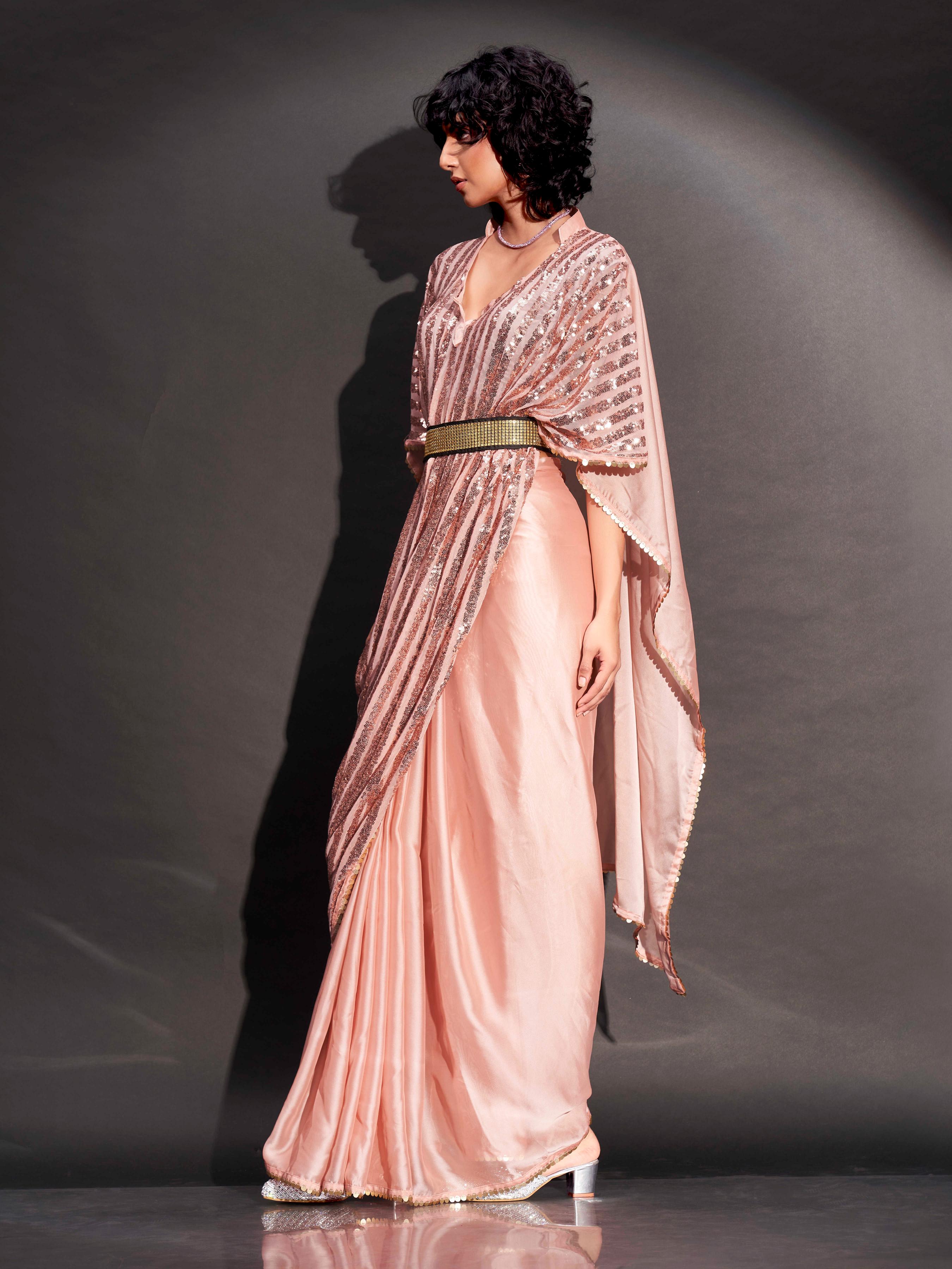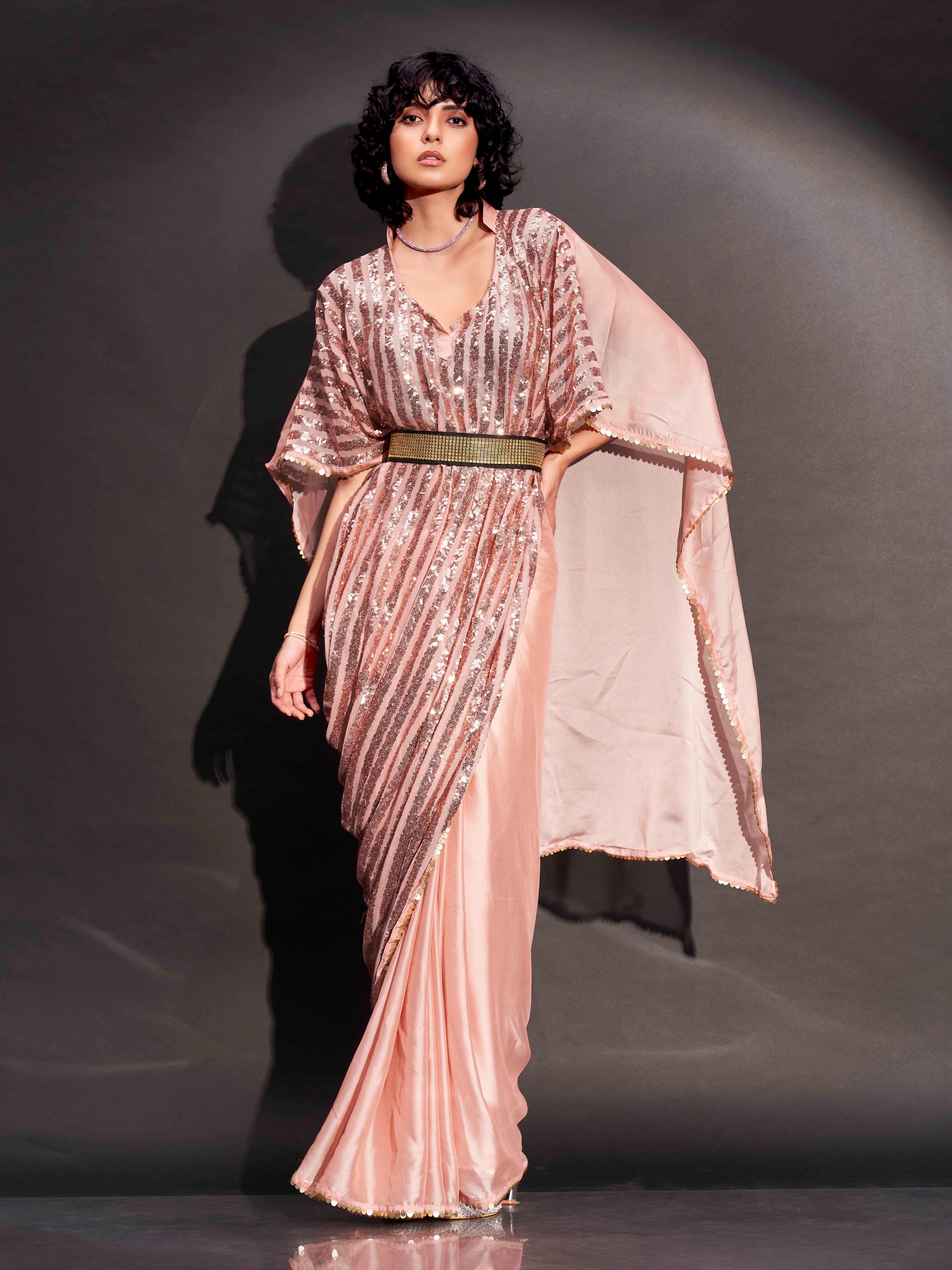 Peach colored designer sequinned kaftan saree with belt and embellished border