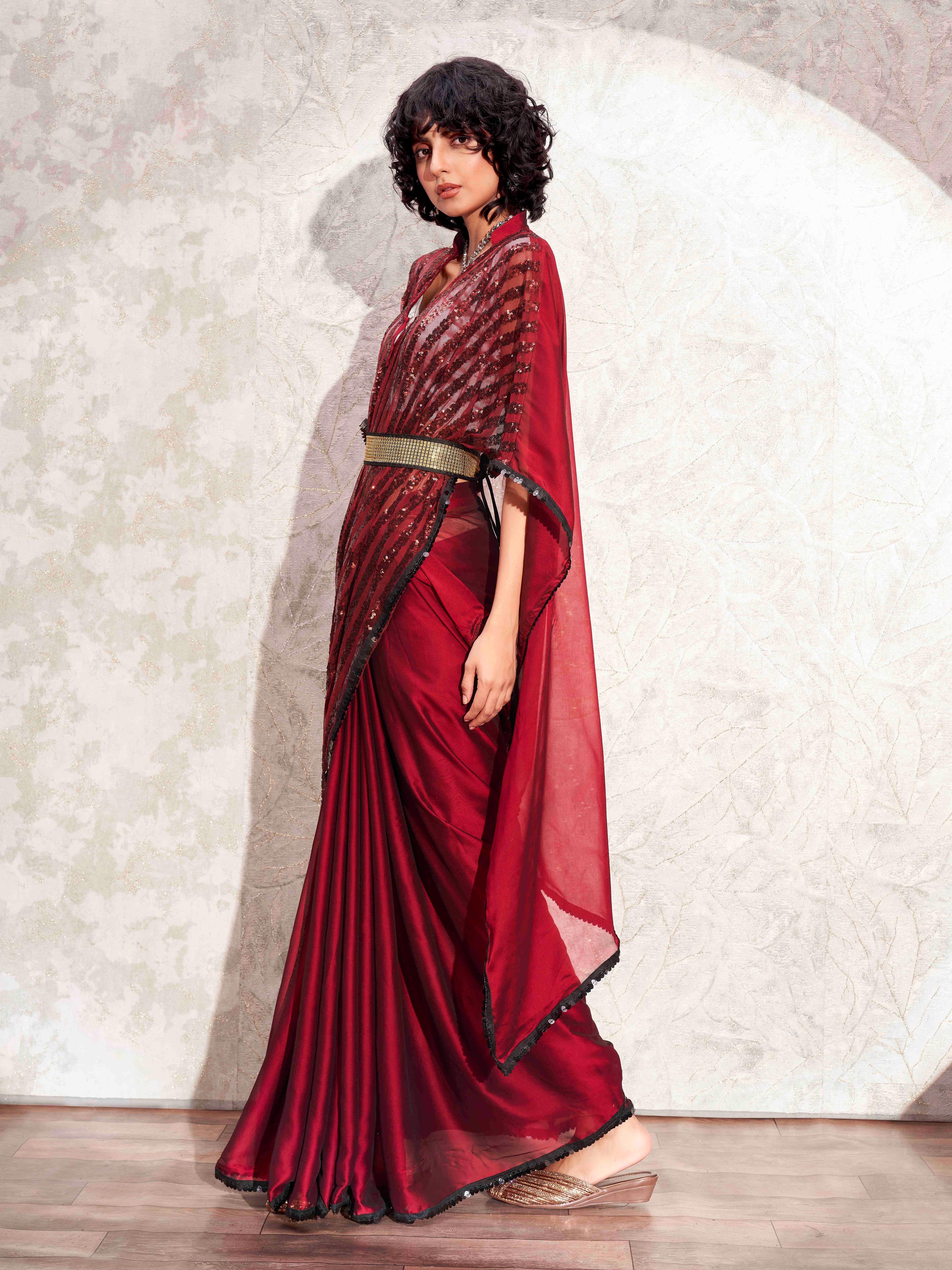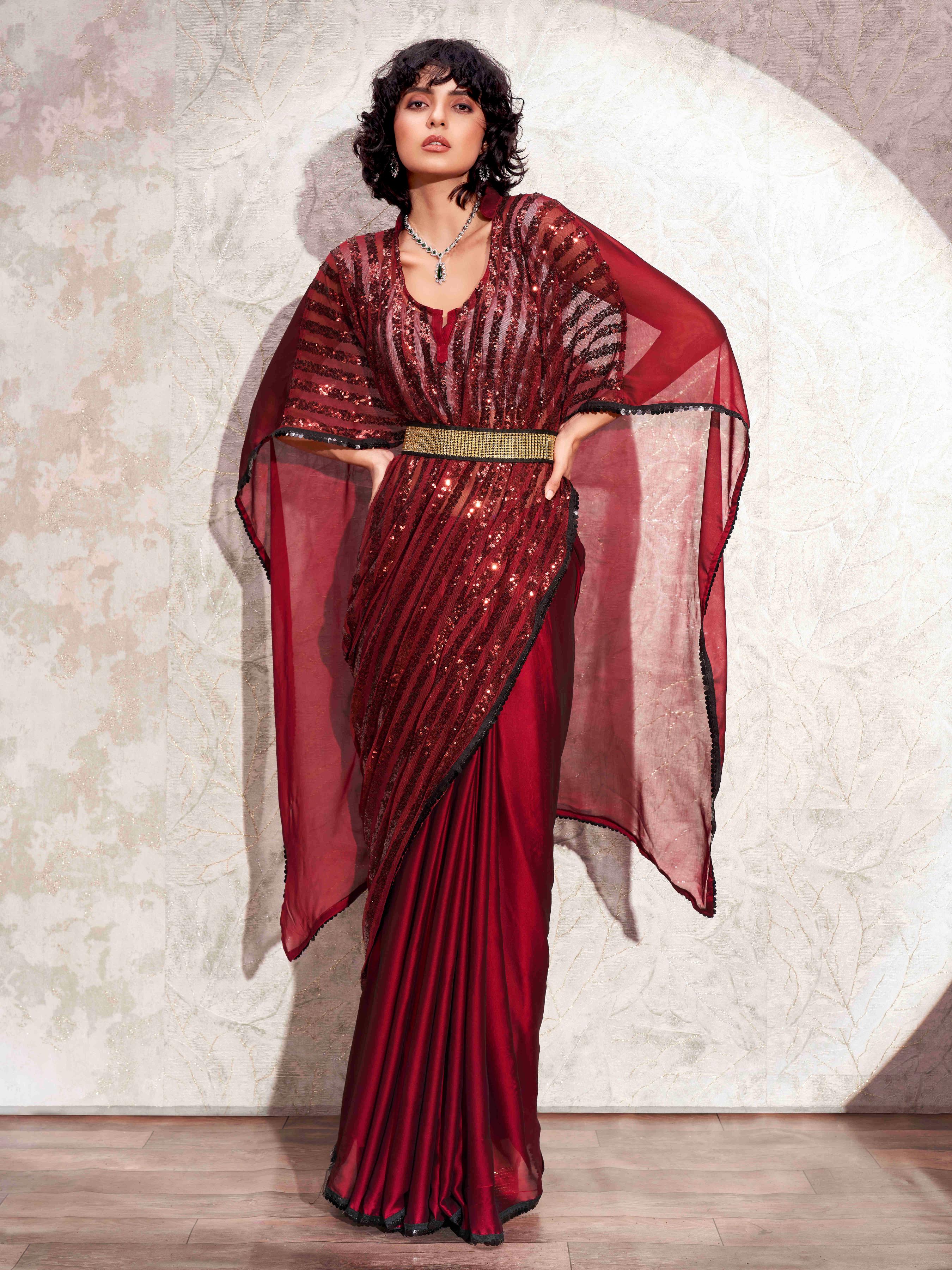 Maroon colored designer sequinned kaftan saree with belt and embellished border