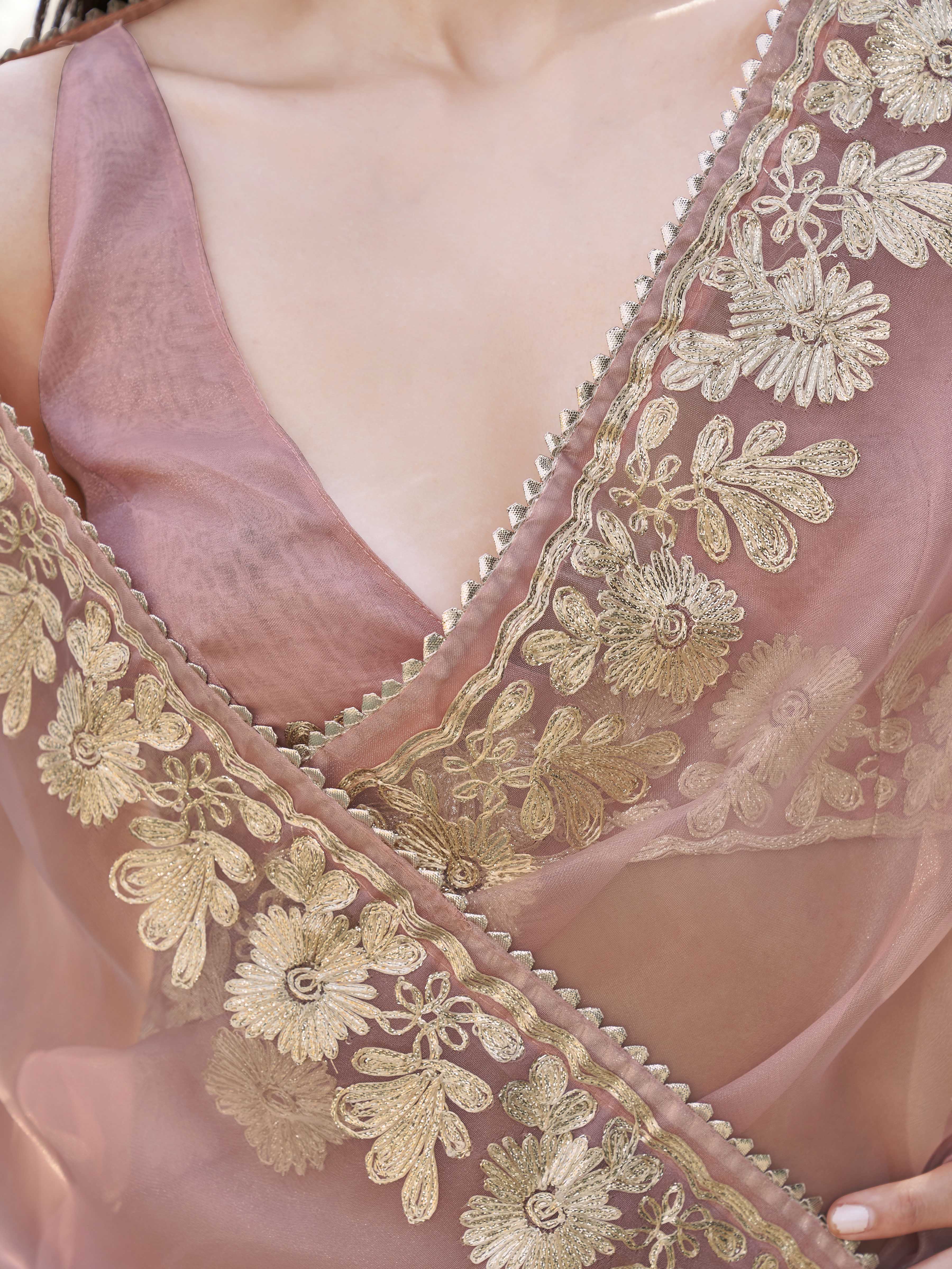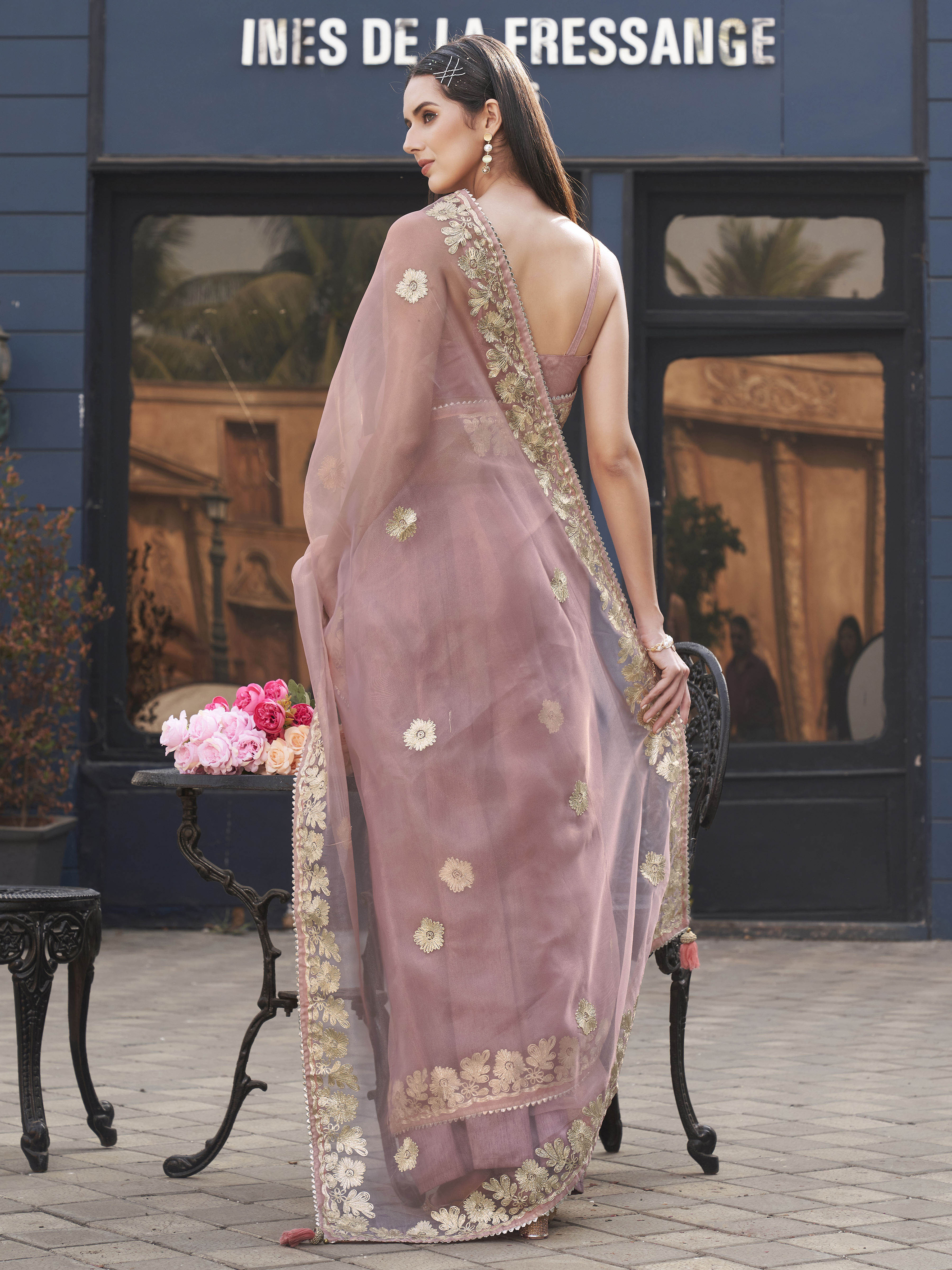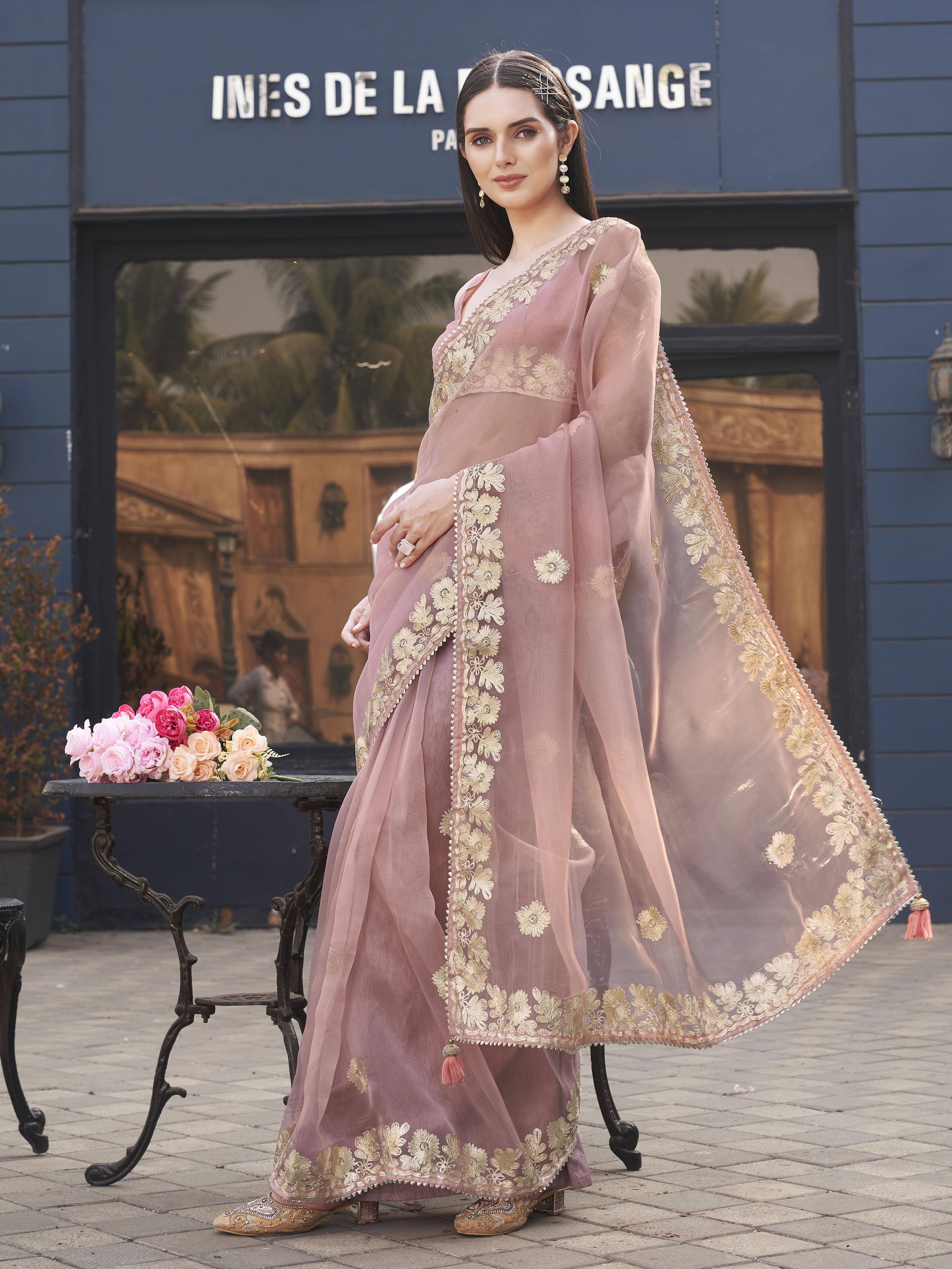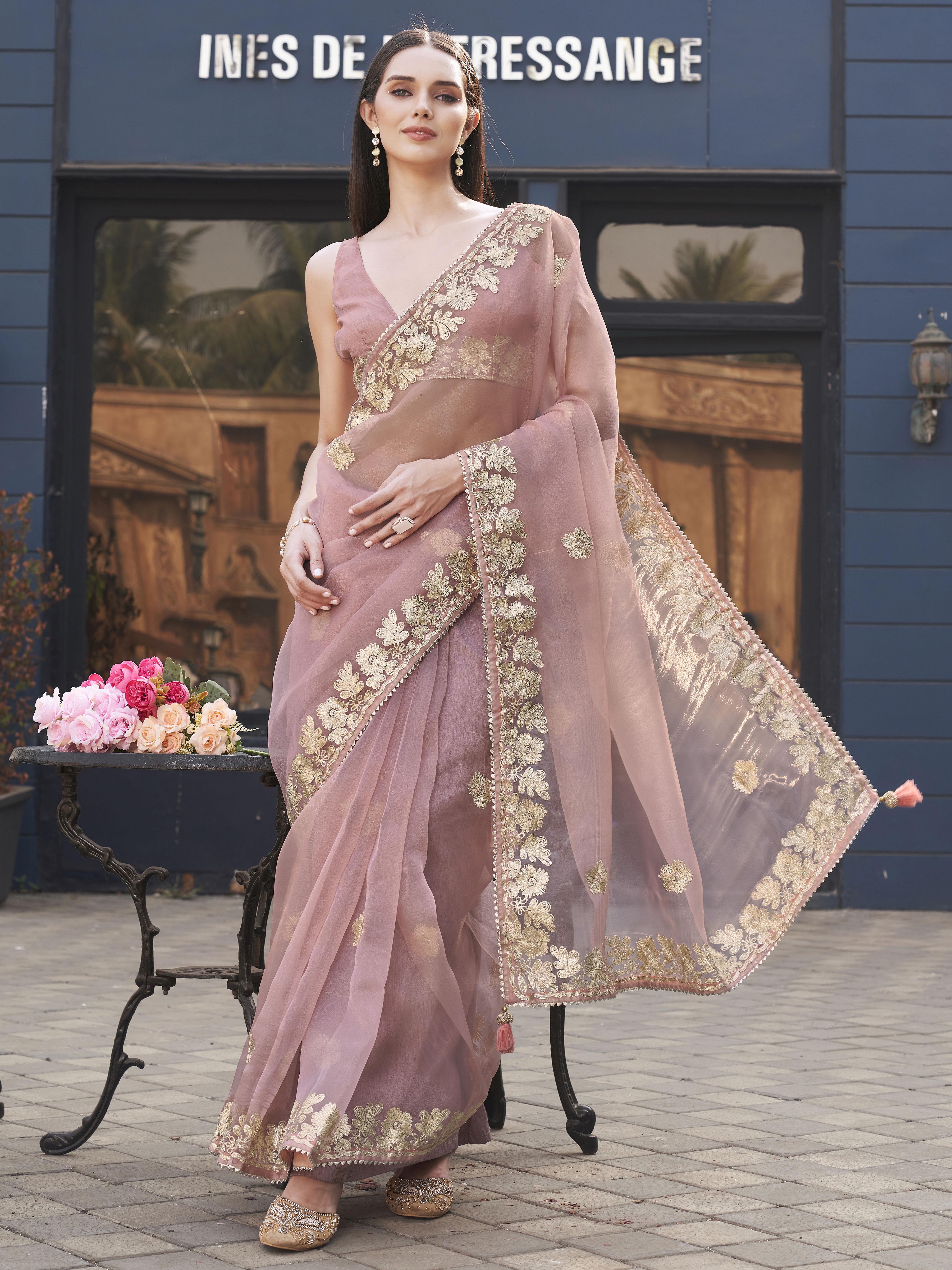 Pink colored shimmer net saree with sequinned butti and embroidered border