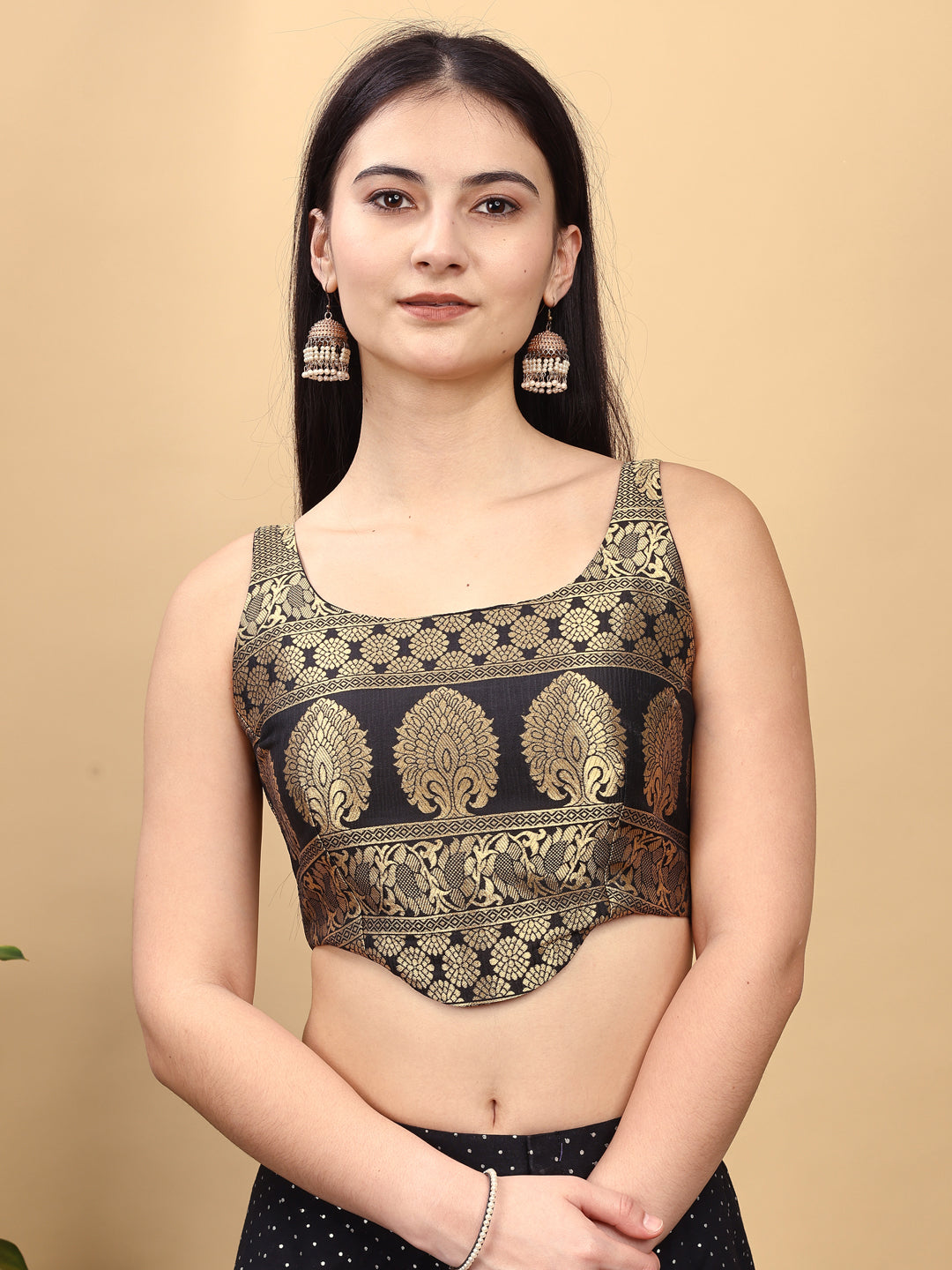 Black colored jacquard corset blouse with tie up at backRs. 1,424.00Rs. 3,747.00