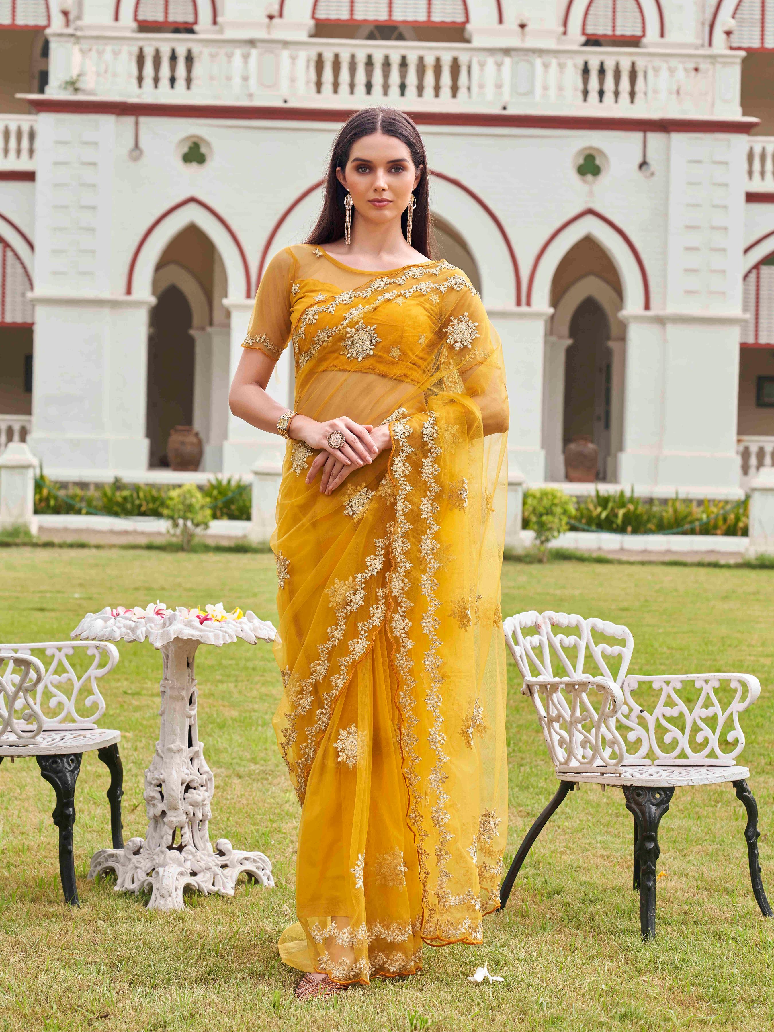 Mustard colored net saree with thread work scalloped border and faux diamonds